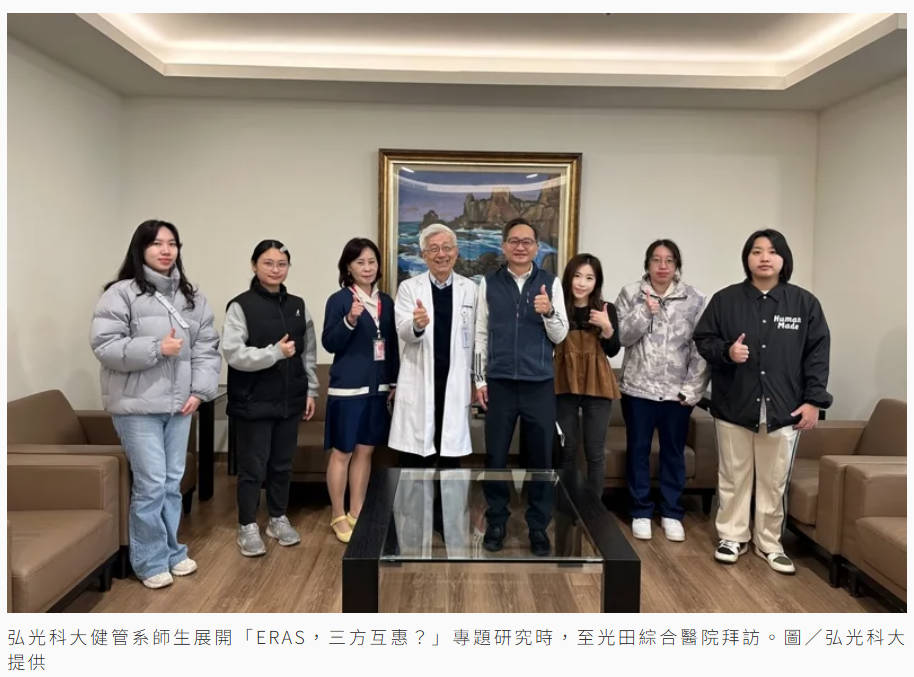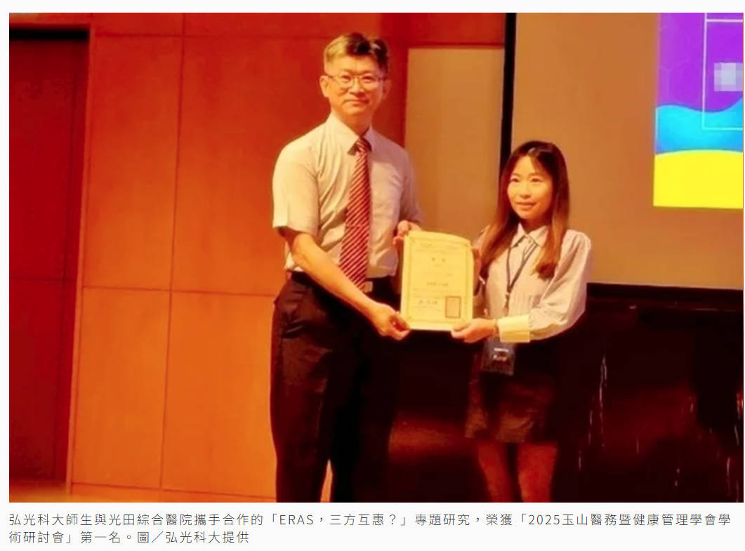 弘光科技大學健康事業管理系師生與光田綜合醫院攜手合作,透過多模式止痛、早期下床活動與營養支持等方式,幫助病人更快康復,這項「ERAS,三方互惠」研究,不但獲得專題研究經費補助,且榮獲「2025玉山醫務暨健康管理學會學術研討會」第一名。
