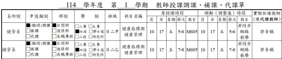 114.10.17(五)/「健康指標與健康管理」/日二甲第5-6節、日二乙第7-8節,上課方式改為「非同步網路教學」