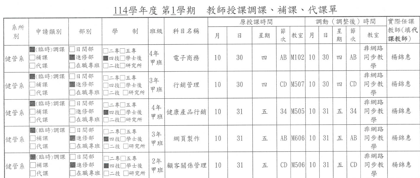 114.10.30(四)/進4甲「電子商務」、進3甲「行銷管理」/上課方式改為「非同步網路教學」