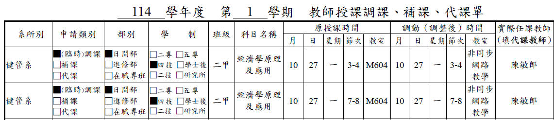 114.110.27(一)/「經濟學原理及應用」/日二甲第3-4節、日二乙第7-8節,上課方式改為「非同步網路教學」
