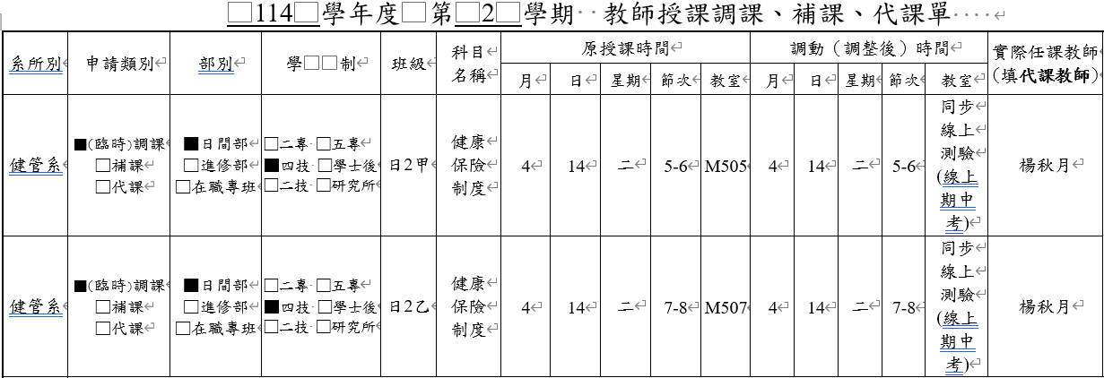 115.04.14(二)/日2甲.日2乙「健康保險制度」/期中考方式改為「同步線上測驗」