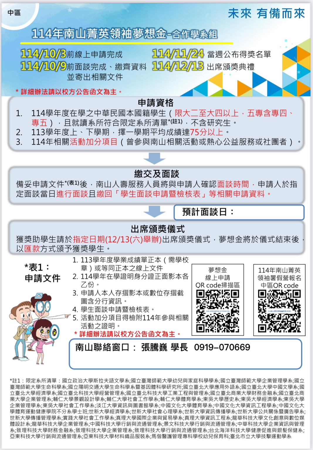 即日起報名至10/03(五)為止,夢想金報名表單🔗https:/survey.nanshanlife.com.tw/s/V1eNy